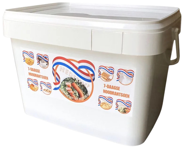 Deze deal bevat zowel het basis noodpakket als ons uitgebreide éénpersoons weekbox met 25 jaar houdbaar Nederlands noodrantsoen. Zo ben jij én voorzien van essentiële noodhulp-tools, én verzekerd van 7 dagen lang 2.000 kcal per dag aan voeding en drinken, veilig opgeborgen in een waterdichte bewaaremmer.Inhoud van het noodpakket
