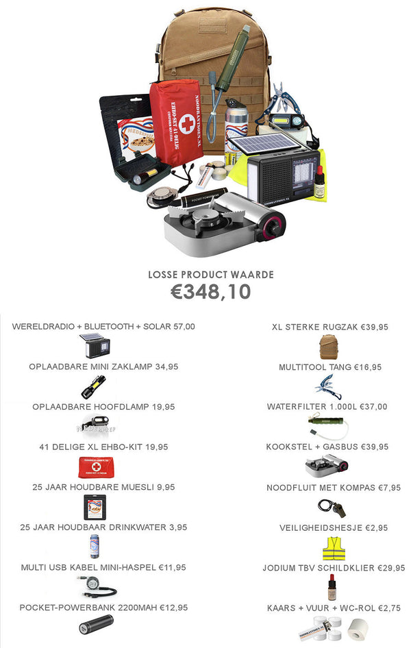 Populaire zoekopdrachten:  Noodpakket  noodrantsoen  waterfilter  72 uur